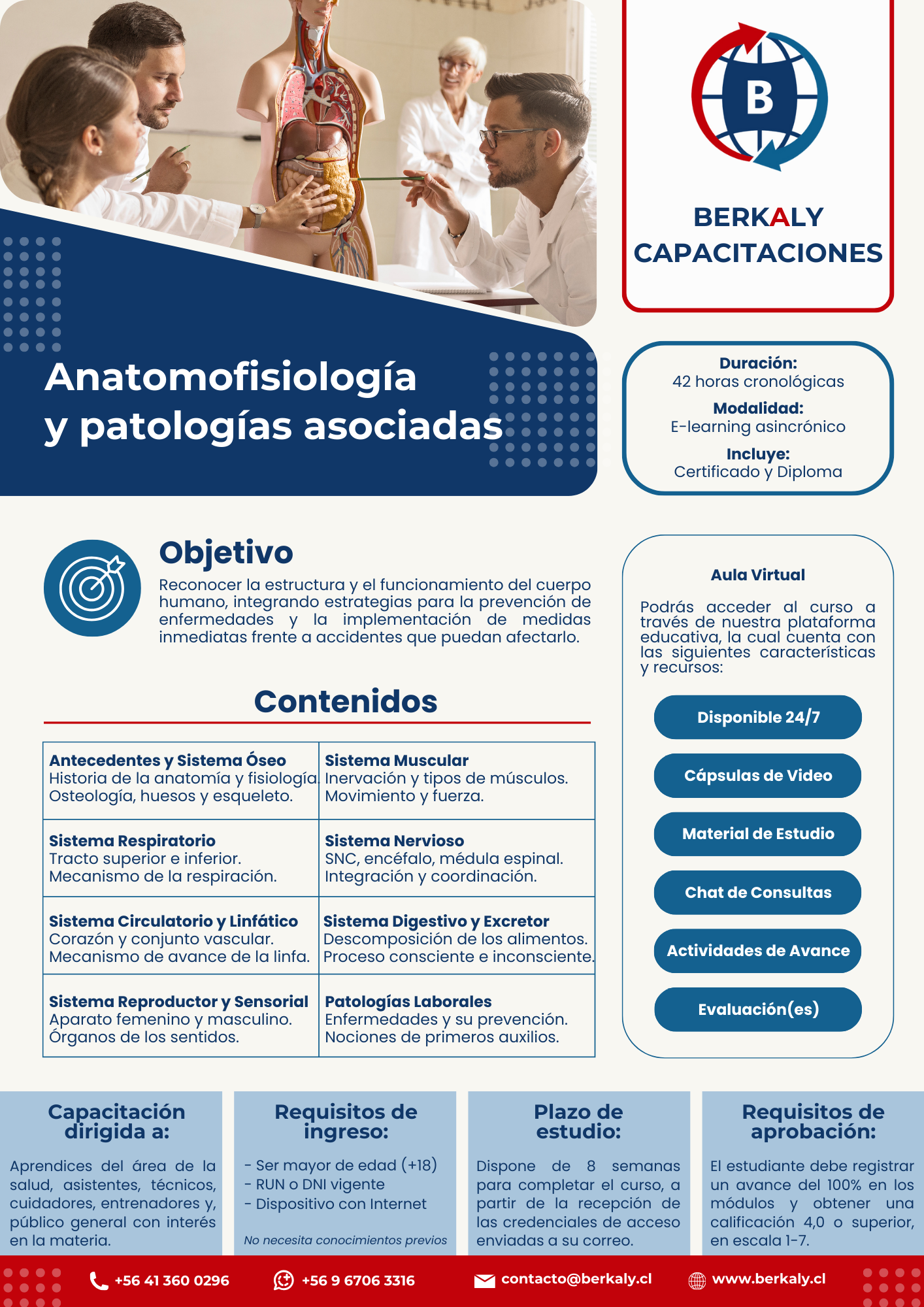 El objetivo del curso es identificar y reconocer los conceptos, estructura y funciones asociadas al cuerpo humano, en conjunto con la prevención de patologías laborales y su intervención inmediata.