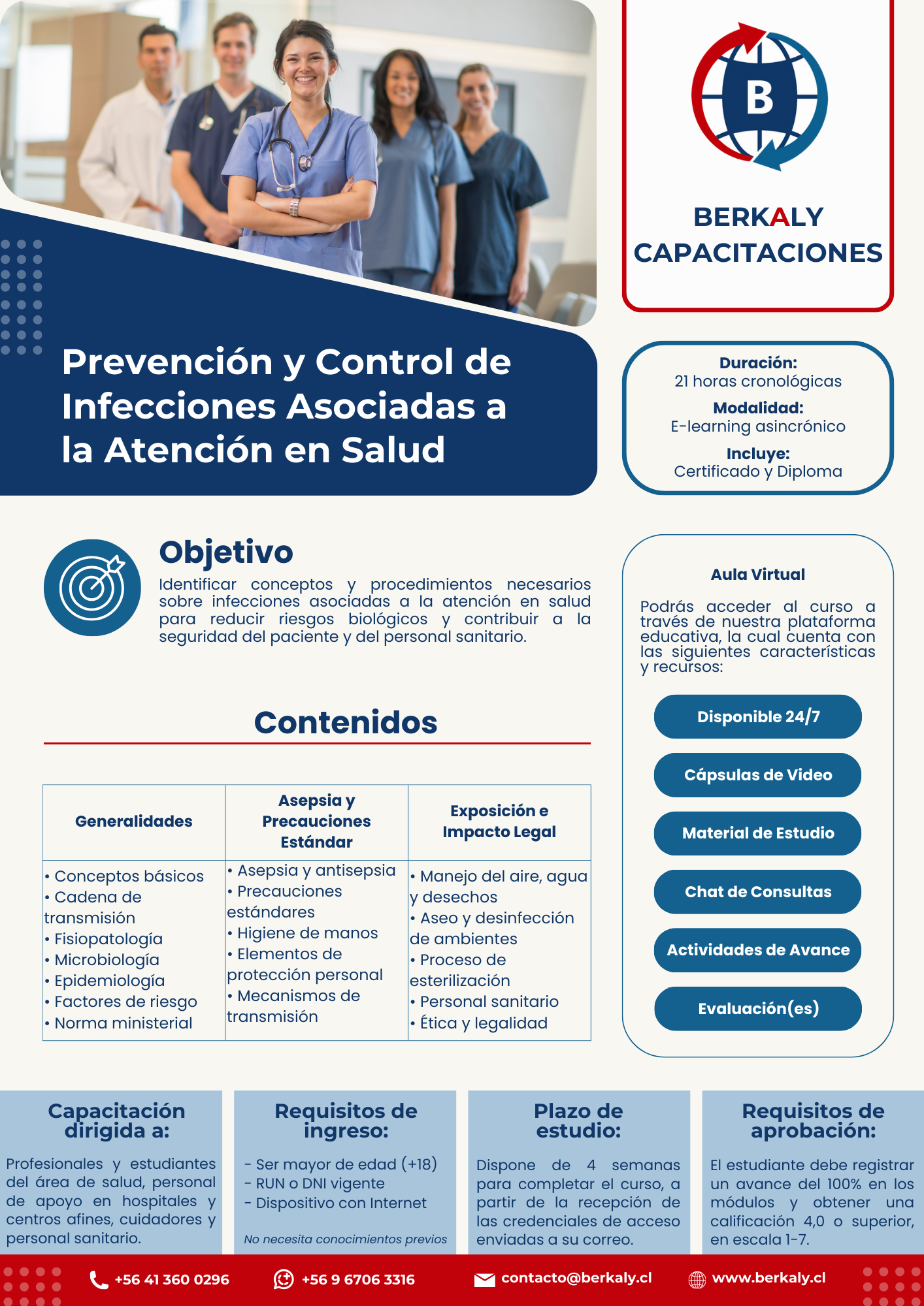 Abordamos las generalidades sobre infecciones asociadas a la atención en salud. Cadena de transmisión. Fisiopatología y microbiología de la infección. Importancia epidemiológica. Factores de riesgo y protector. Norma Ministerial. Asepsia y Antisepsia. Precauciones Estándar y EPP. Manejo de áreas clínicas y aspectos ambientales. Desechos clínicos, esterilización y desinfección. Riesgos en el personal sanitario e impacto ético y legal.