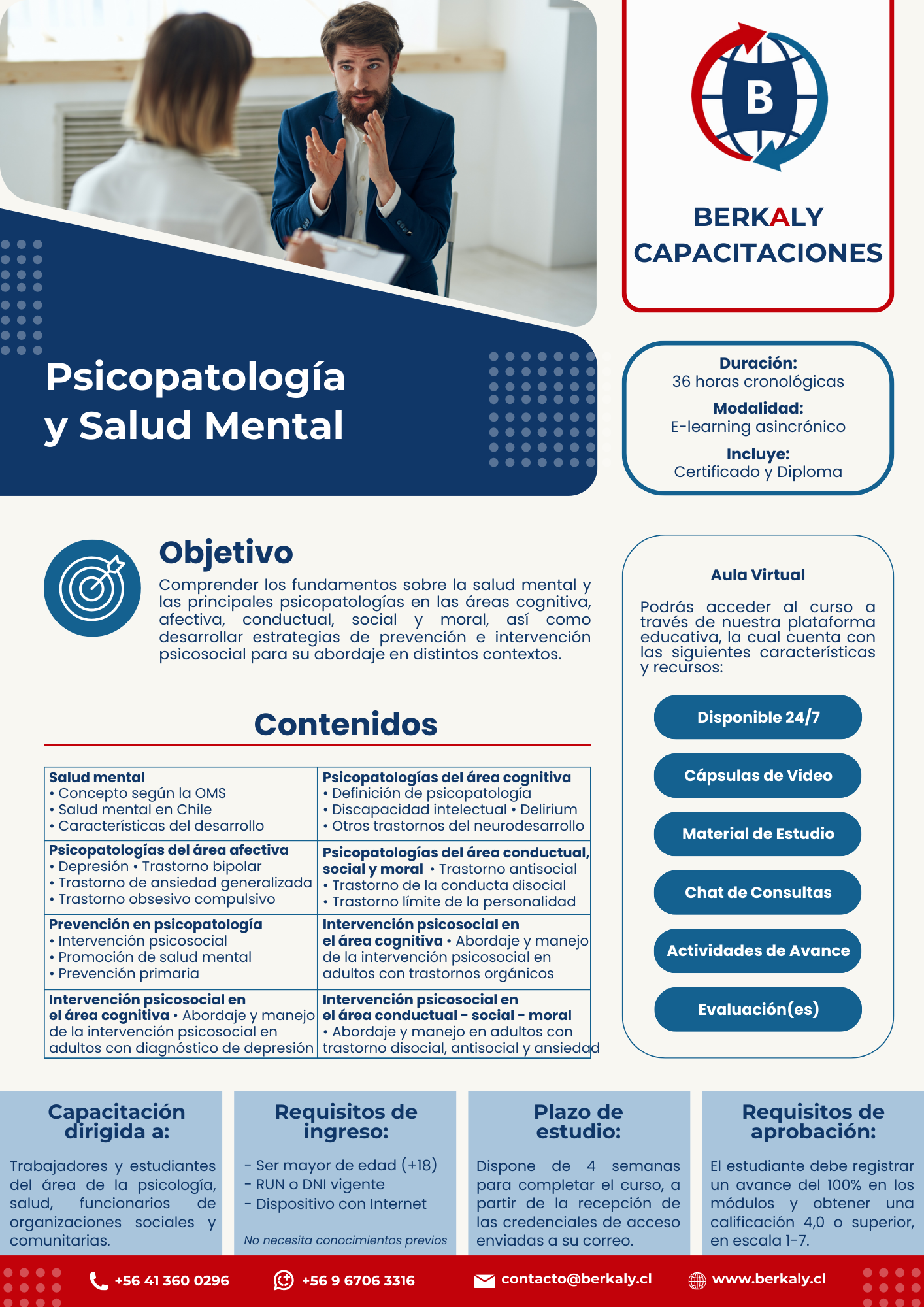 Abordamos la Salud Mental según la OMS y la Salud Mental en Chile. Nivel de inteligencia y tipos de pensamiento. Control de impulsos. Desarrollo psicológico afectivo. Expresión emocional. Relaciones interpersonales, familia y pareja. Estructuras de personalidad. Normalidad y anormalidad. Discapacidad intelectual y trastornos. Depresión y ansiedad. Trastorno bipolar y obsesivo compulsivo. Trastorno antisocial y conducta disocial. Personalidad límite. Prevención en psicopatología. Intervención psicológica y social y otros temas asociados.